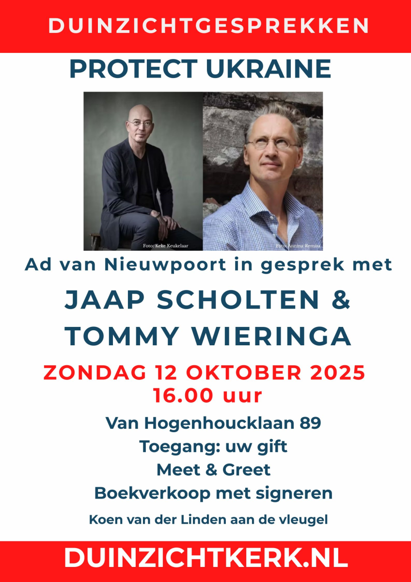 ![]() Tommy Wieringa en Jaap Scholten in de Duinzichtkerk Op zondag 12 oktober gaat Ad van Nieuwpoort in zijn serie Duinzichtgesprekken in gesprek met de schrijvers Tommy Wieringa en Jaap Scholten over hun project Protect Ukraine. Beide schrijvers hebben meteen na de Russische inval in Oekraïne zich persoonlijk het lot aangetrokken van de Oekraïense bevolking. Met regelmaat van de klok gaan zij met een konvooi daar naartoe om voertuigen en beschermingsmiddelen te brengen naar Oekraïense legereenheden. ‘Nu kunnen we de tirannie daar nog tegenhouden’, zo zegt de in Hongarije wonende Jaap Scholten, ‘in mijn land kan dat al niet meer’. Vorig jaar verscheen van de hand van bestsellerauteur Tommy Wieringa het boek ‘Konvooi. Reizen naar een land van oorlog’. Een aangrijpend verslag van wat hij meemaakt tijdens de verschillende reizen naar Oekraïne in oorlog. Hij staat daarmee in de traditie van schrijvers als Joseph Roth en Isaak Babel die ook verslag deden van eerdere oorlogen in datzelfde gebied. Van Jaap Scholten verschijnt deze dagen ‘Nastya in Charkiv. Naar de frontlinie van Europa’ met foto’s van Eddy van Wesel. Beide boeken zijn na afloop verkrijgbaar. De opbrengst is voor Protect Ukraine. Zondag 12 oktober om 16 uur in de Duinzichtkerk, Van Hogenhoucklaan 89, met na afloop meet&greet. Toegang: uw gift. |