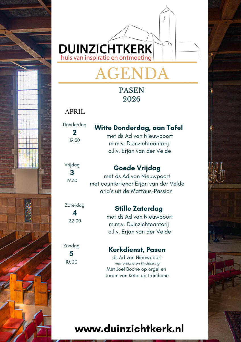 ![]() De Duinzichtkerk is een open huis van inspiratie en ontmoeting in Den Haag voor wie maar wil. Al meer dan negentig jaar komen hier mensen samen om wekelijks nieuwe inspiratie op te doen voor hun leven, hun werk en voor de wereld dichtbij en ver weg. Bron van inspiratie is het aloude Bijbelverhaal. In een wereld die gedomineerd wordt door de waan van de dag, heersende opinies en vooroordelen wordt wekelijks in dit verhaal een bevrijdende en hoopvolle tegenstem gehoord. In het verbinden van deze stem met de vragen van vandaag vinden op allerlei verschillende manieren velen elkaar in de Duinzichtkerk. Hartelijk welkom! |